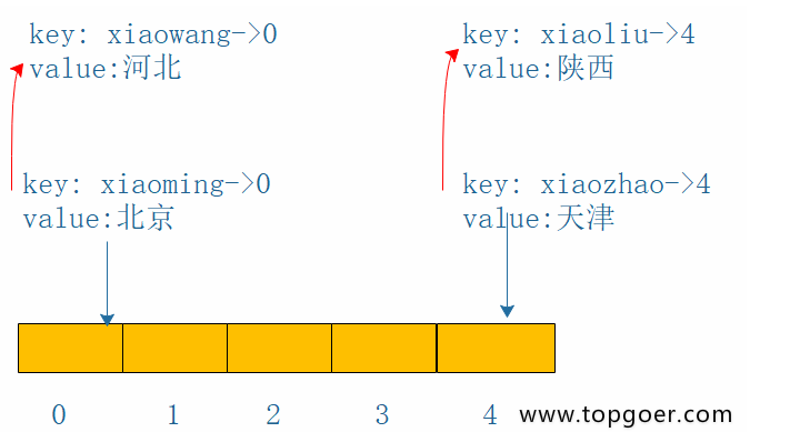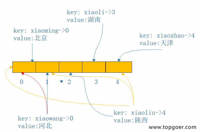 如下图:首先存储key=xiaoming在下标0处,当存储key=xiaowang时,hash冲突了,按照线性探测,存储在下标1处,(红色的线是冲突或者下标已经被占用了)