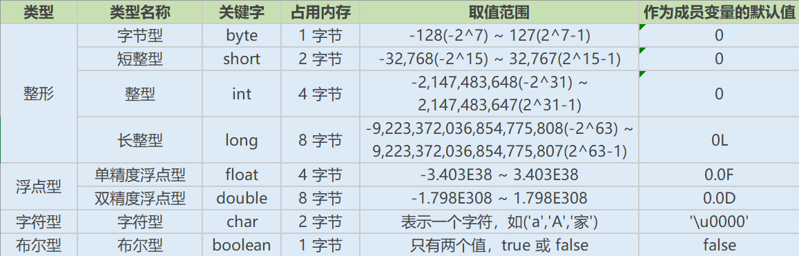 包装类型:Boolean,Character,Byte,Short,Integer,Long,Float,Double