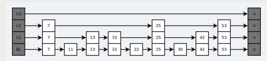 跳跃表是基于多指针有序链表实现的,可以看成多个有序链表。