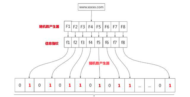 可以先有一亿个二进制比特,然后网警用八个不同的随机数产生器(F1,F2, …,F8) 产生八个信息指纹(f1, f2, …, f8)。接下来用一个随机数产生器