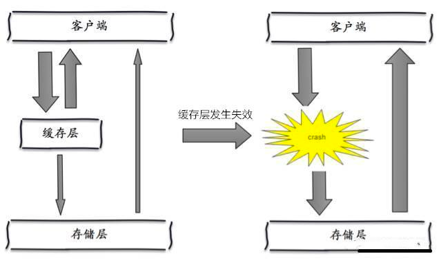 缓存雪崩是指,缓存层出现了错误,不能正常工作了。于是所有的请求都会达到存储层,存储层的调用量会暴增,造成存储层也会挂掉的情况。